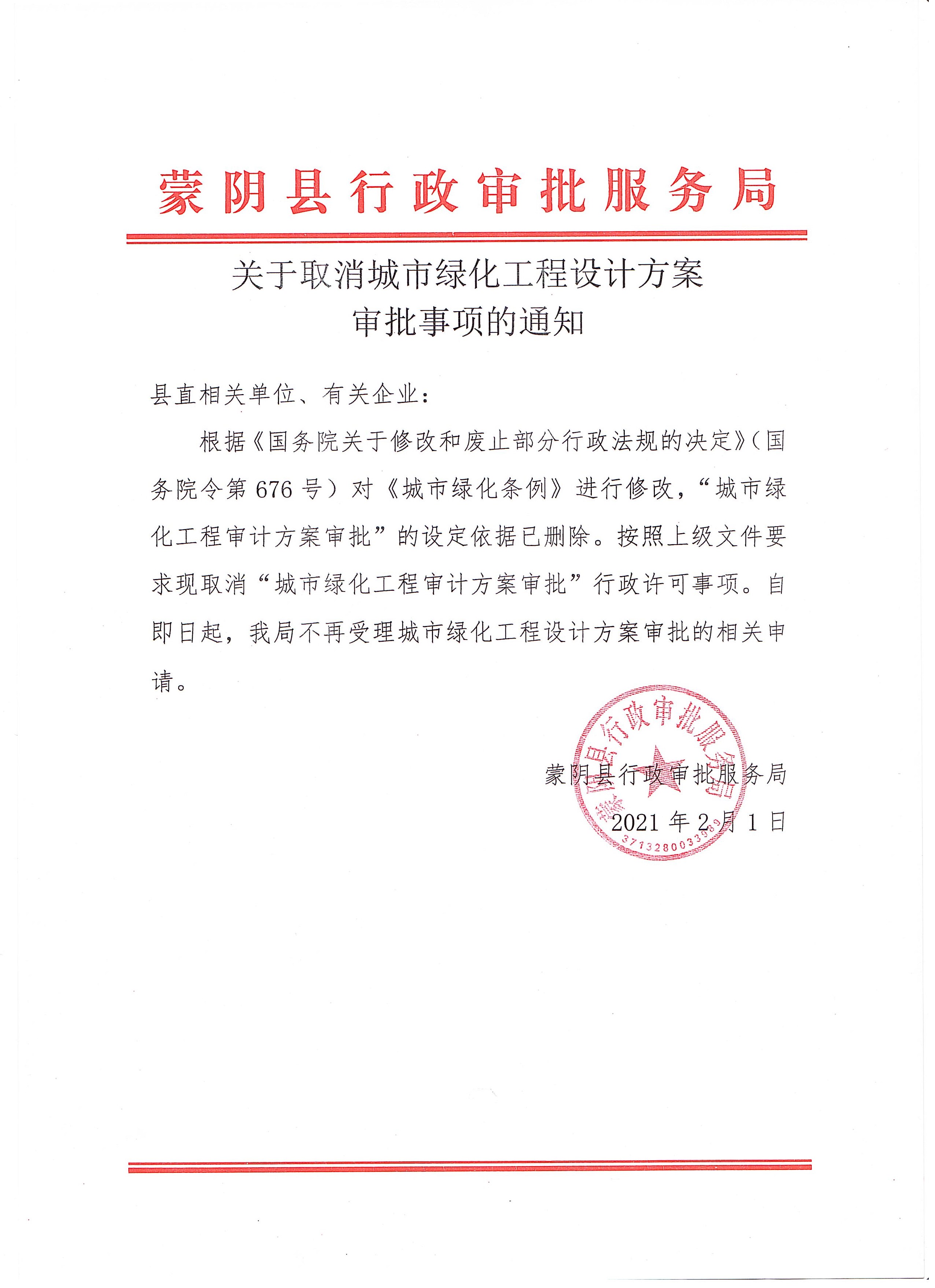 关于取消城市绿化工程设计方案审批事项的通知