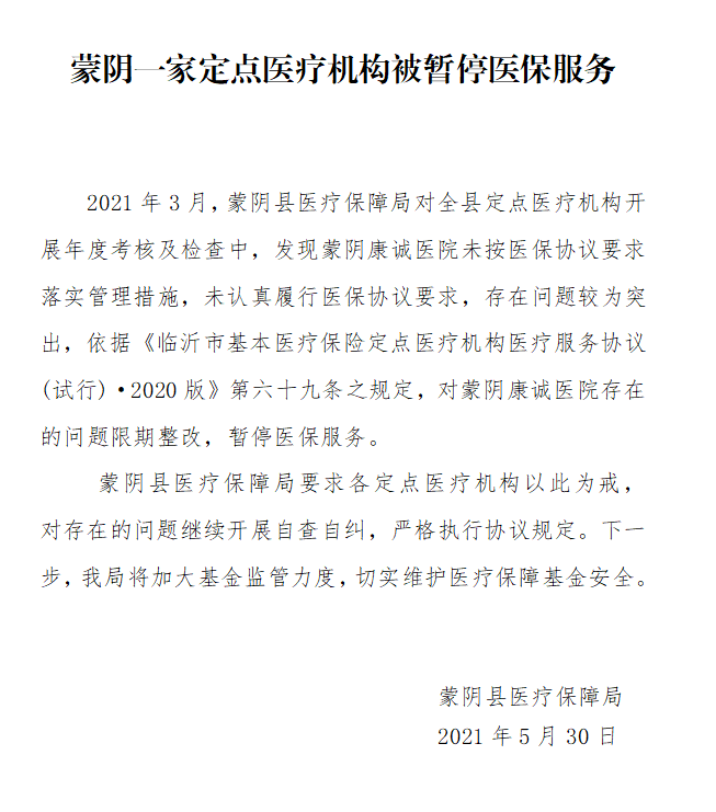 蒙阴一家定点医疗机构被暂停医保服务