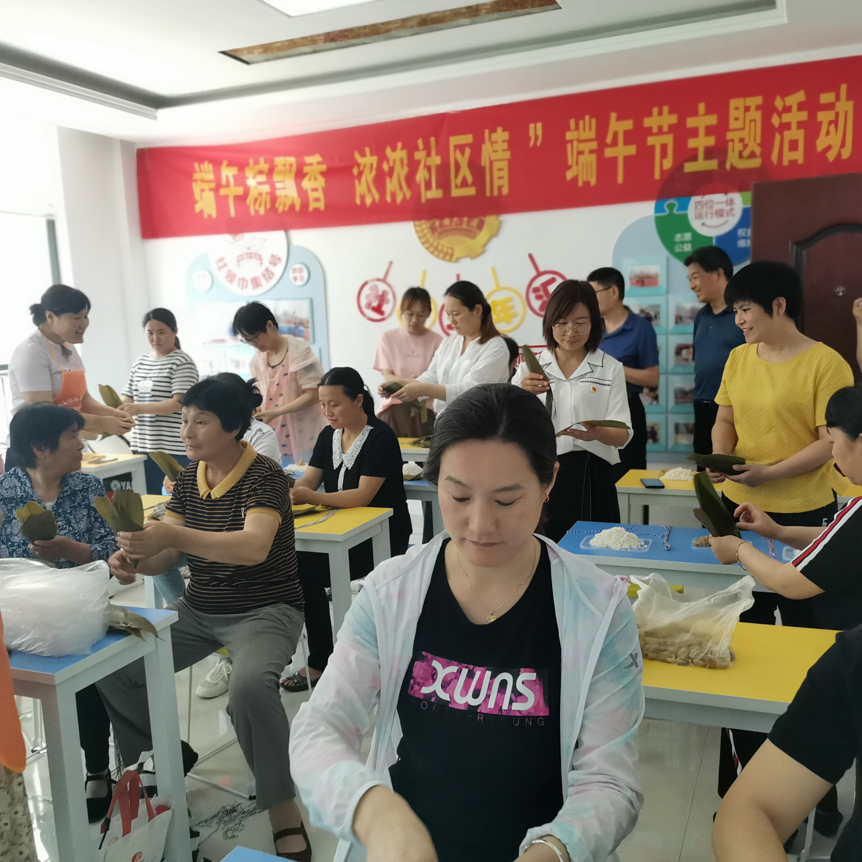 2021年6月11日为丰富社区居民生活,在传统的民俗佳节——端午节来临之际,县商务发展服务中心联合县执法局、商城社区开展“端午粽飘香 浓浓社区情”端午节主题“双报到”活动。邀请社区居民一起包粽子迎端午,请来银桥技校的老师培训包粽子的技巧,工作人员和居民一起包粽子,整个活动现场欢声笑语、其乐融融。