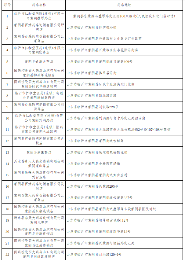 根据《零售药店医疗保障定点管理暂行办法》(国家医疗保障局令第3号)《临沂市基本医疗保险新增协议定点药店评估量化评分表》文件精神,经审查申报材料、实地考查和三方综合评审,现拟将临沂市仁和堂医药(连锁)有限公司蒙阴叠翠路店等22家零售药店拟纳入医保协议定点零售药店管理。