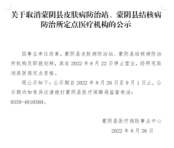 关于取消蒙阴县皮肤病防治站、蒙阴县结核病防治所定点医疗机构的公示