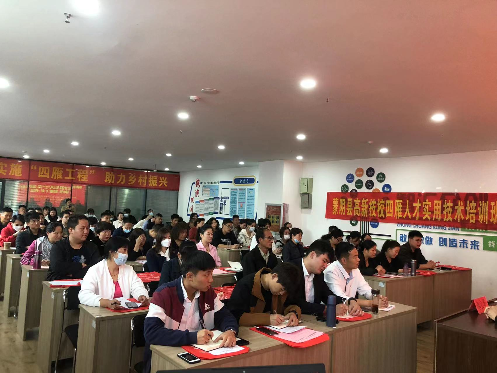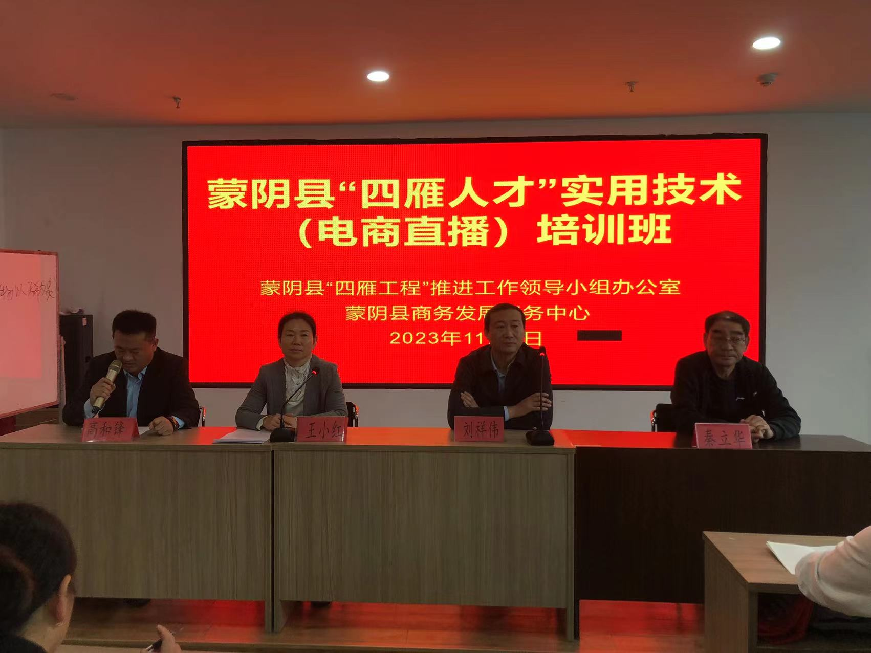 为深入推进“四雁工程”,培育乡村振兴新动能,促进四雁人才技能提升,县商务发展服务中心联合县“四雁工程”推进工作领导小组办公室、县残疾人联合会、高新职业技术学校开展电商直播人才培训,于2023年11月2日-11月5日在高新技术学校举办了为期4天的线下免费电商直播人才培训活动,县“四雁工程”推进工作领导小组办公室农业农村发展服务中心乡村人才开发培训服务股副股长王小红、县商务发展服务中心副主任刘祥伟,县残疾人联合会副理事长秦立华参加开班仪式并分别做重要讲话,本次活动采用4+6+3模式即(4天线下直播培训+6天线上辅导+3天实操培训),培训结束后统一考试,成绩合格者颁发《“四雁人才”电商直播培训合格证书》,认定为蒙阴县“电商鸿雁”人才,符合条件的给予“四雁工程”相关政策支持。