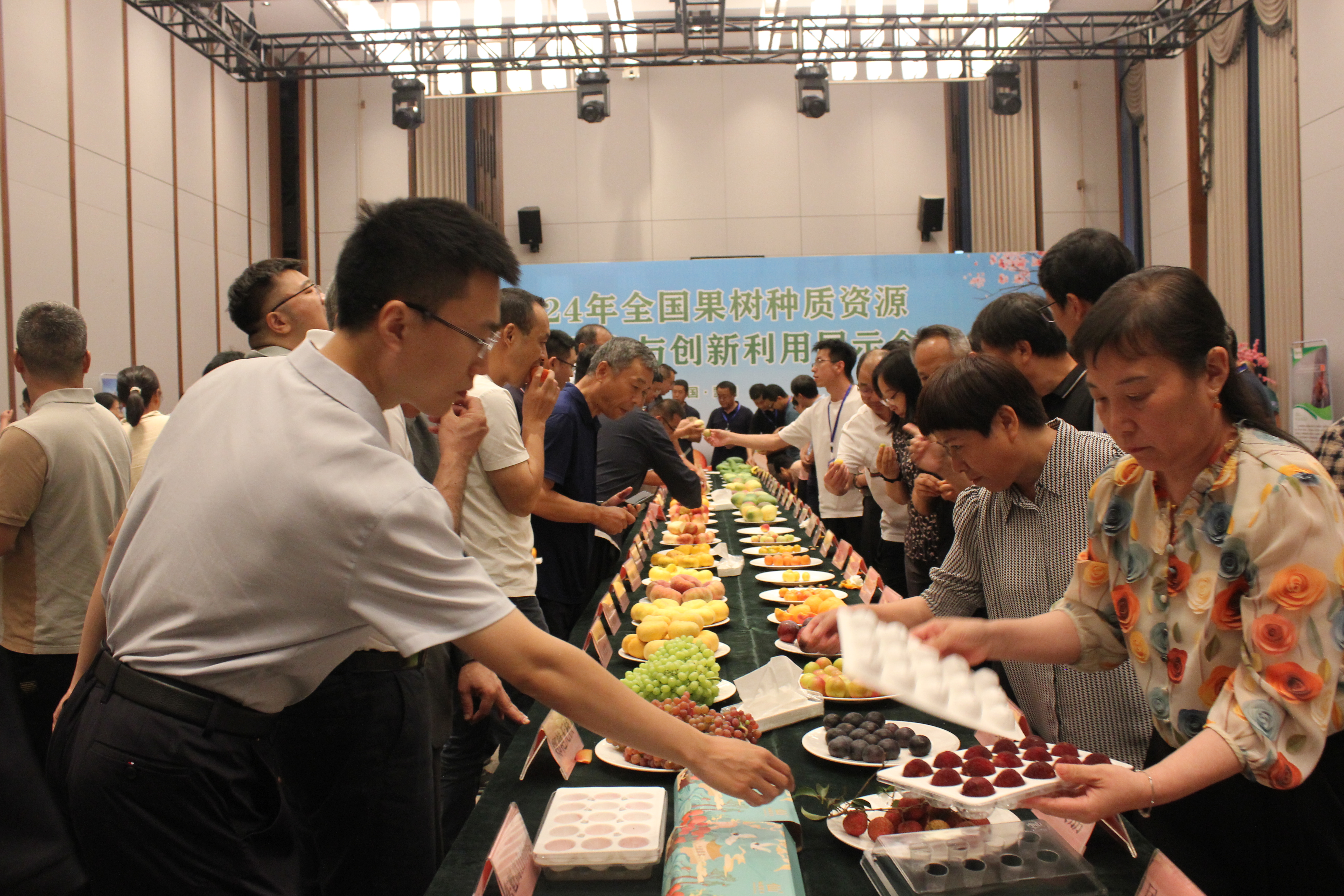 会议期间还举行了优异资源展示,共展出样品150多份,其中桃120份包括中油蟠9号、中油蟠7号、中蟠11号、中油蟠13号等优异品种,其他果树30多份。