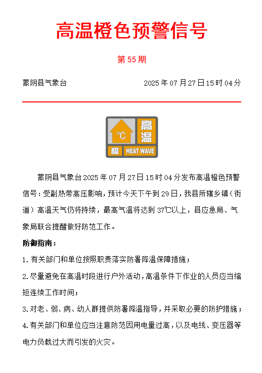 高温橙色预警信号20250727
