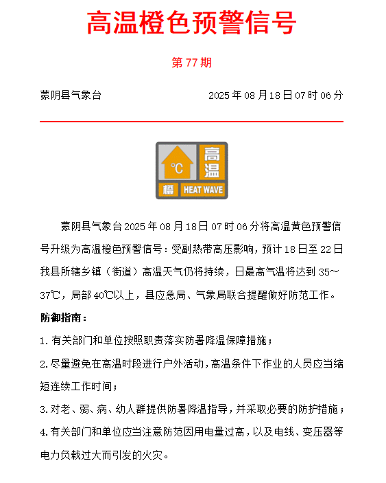 高温橙色预警信号20250818