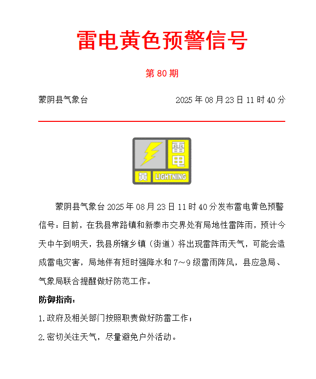 雷电黄色预警信号20250823