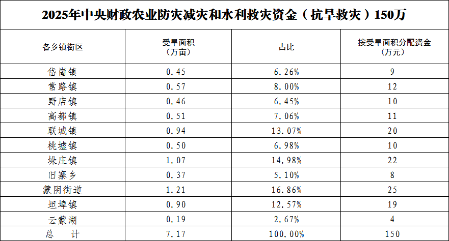 本次农业生产和水利救灾资金主要来源于乡村振兴重大专项资金,共计150万元。根据各镇街作物种植面积等情况,现对资金分配如下: