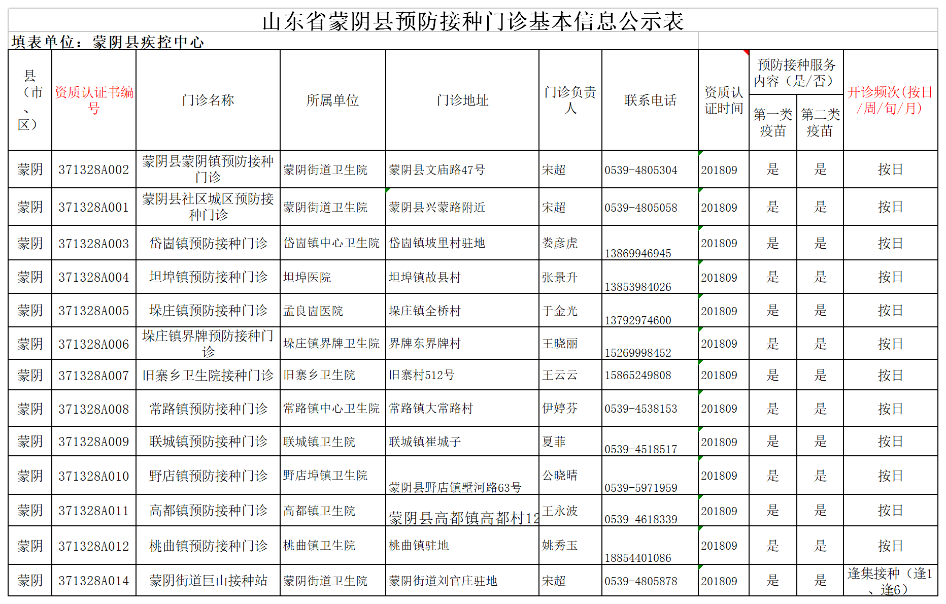 山东省蒙阴县预防接种门诊基本信息公示表