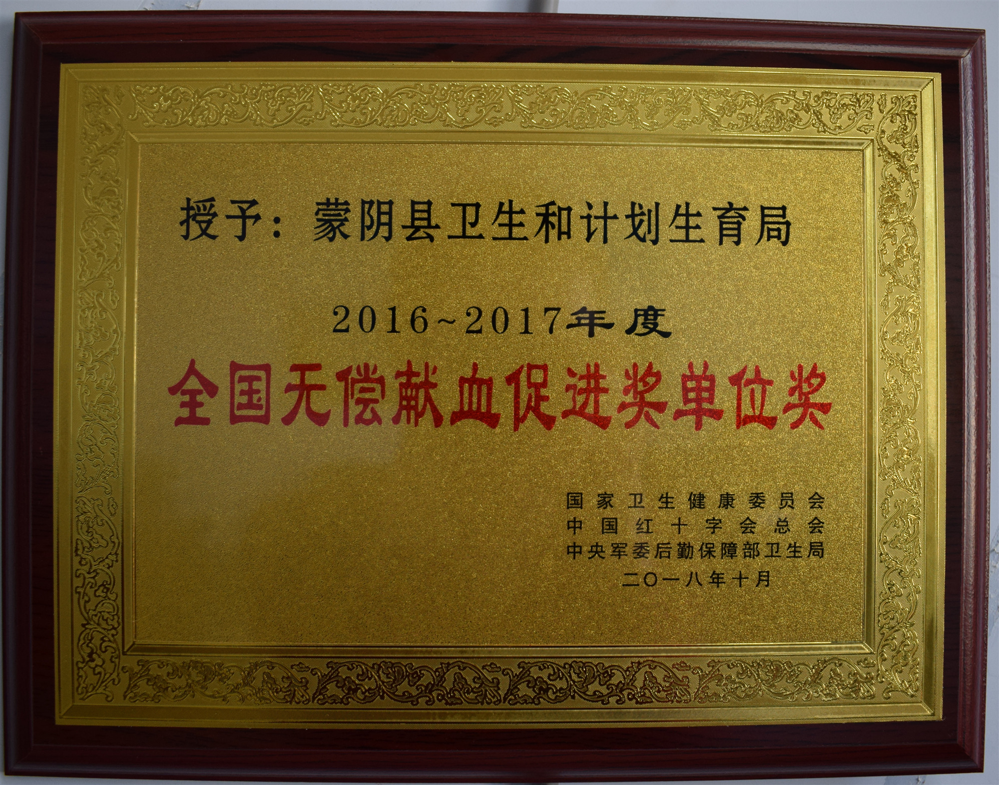 近日,国家卫生健康委员会、中国红十字会总会、中央军委后勤保障部卫生局授予蒙阴县卫生和计划生育局2016--2017年度“全国无偿献血促进奖单位奖”,也是临沂市唯一获此殊荣的县区。