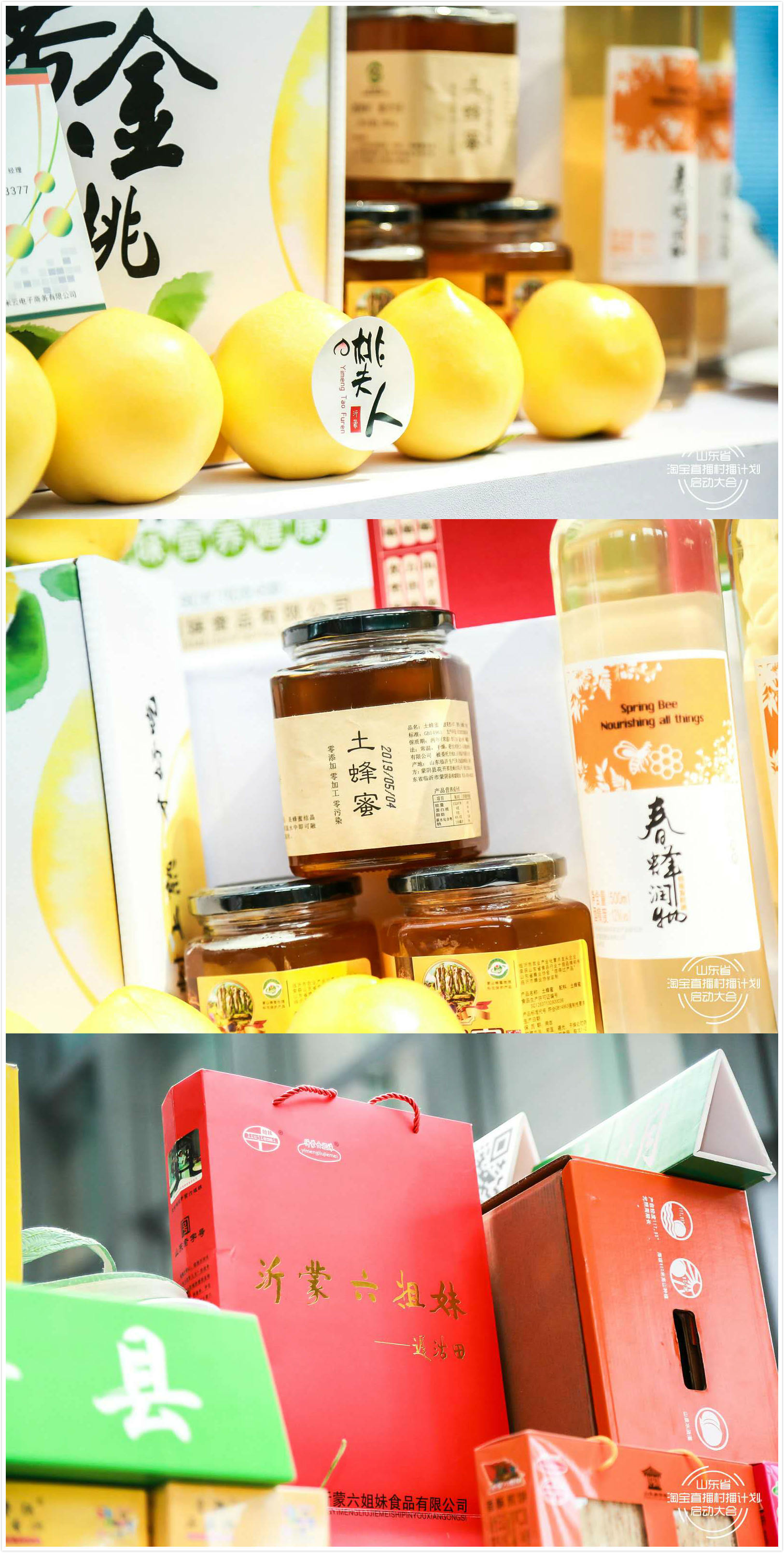 蒙阴蜜桃、蒙阴蜂蜜、蒙阴大樱桃、六姐妹煎饼、蒙阴小米等众多产品在现场展示,并通过淘宝官方频道“淘live”上13个直播间不间断直播。此次直播,13个直播间累计观看人次突破300万人次,蒙阴蜜桃、蜂蜜、大樱桃销售共计4000余单,销售额近20万元。