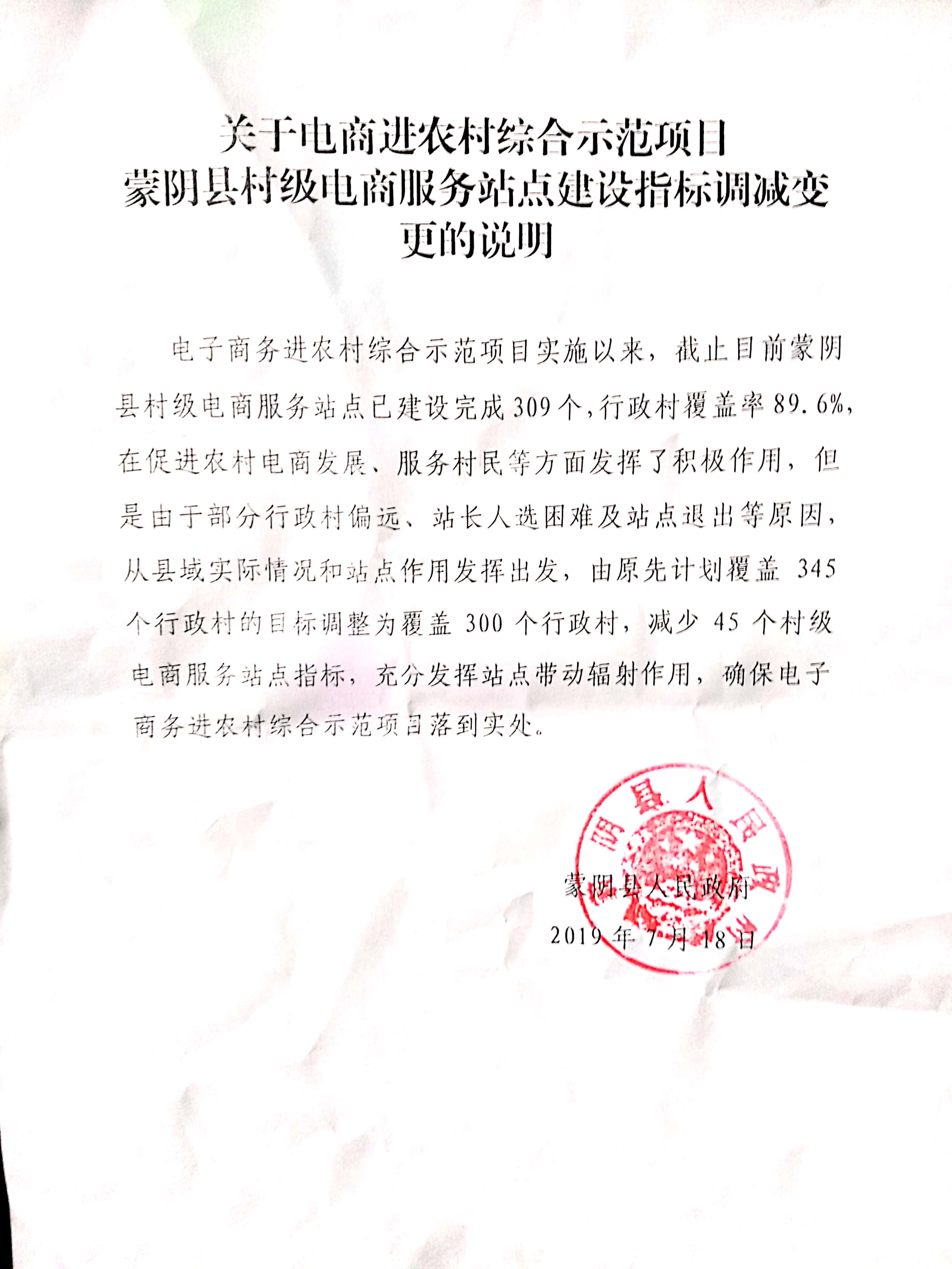 关于电商进农村综合示范项目 蒙阴县村级电商服务站点建设指标调减变更的说明公示