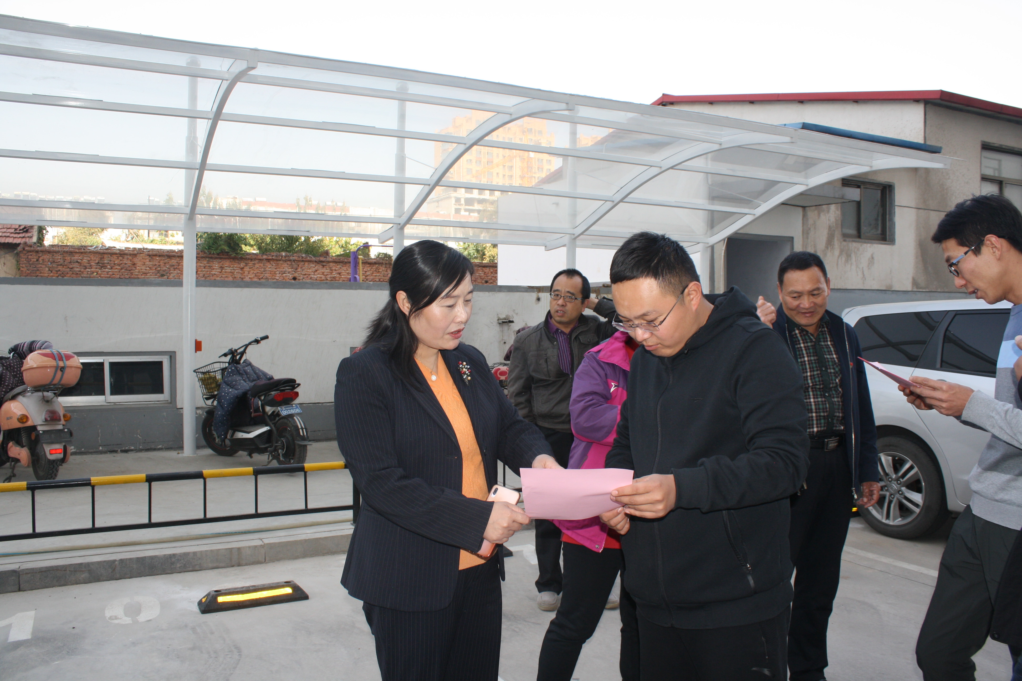 为进一步推进“不忘初心、牢记使命”主题教育取得实效,深化“双报到”工作,10月30日,县住房保障中心与红庙社区党组织联合开展主题党日活动,实地查看荣华家园共驻共建项目,向物业和小区业主发放红色物业星级评定标准、住宅专项维修资金使用规定等宣传明白纸。电动车车棚及充电桩已安装完成,极大便利了业主的生活,营造了安全舒适的小区环境,获得居民的一致好评。