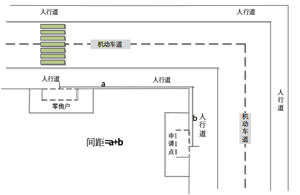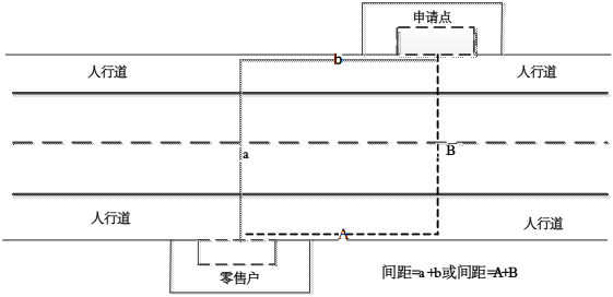 3.申请点与最近零售点的经营场所位于道路两侧,道路无隔离带和斑马线情形的,测量按直角分段测量,分段距离之和即为申请点与最近零售点经营场所间的距离。(如图3所示)