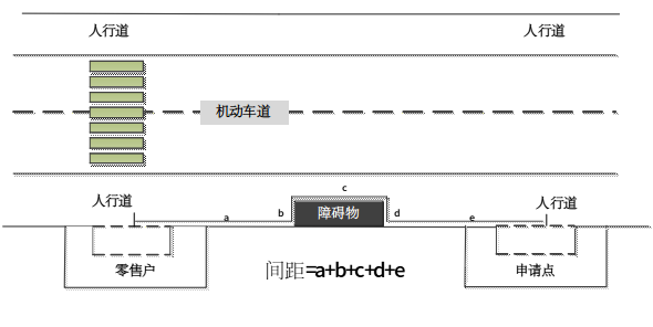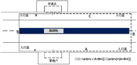4.申请点与最近零售点的经营场所位于道路两侧的,道路有隔离带但无斑马线情形的,选取最近障碍物断口开处,测量按直角分段测量,分段距离之和即为申请点与最近零售点经营场所间的距离。(如图4所示)
