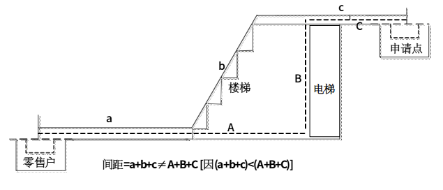8.申请点与最近零售点的经营场所之间有台阶、楼梯的,以其平面坡长进行测量(如图8所示);有电梯的,以层高进行测量;楼梯与电梯并存的,以最短距离的为准。