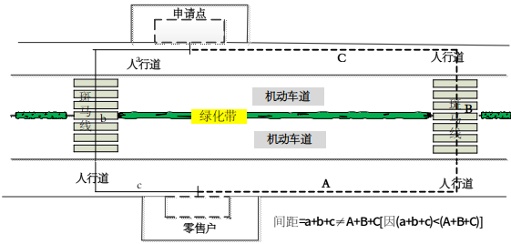 5.申请点与最近零售点的经营场所位于道路两侧的,道路上有隔离带且有斑马线的,从隔离带最近开口处选取最近斑马线,按直角分段测量,分段距离之和即为申请点与最近零售点经营场所间的距离。(如图5所示)