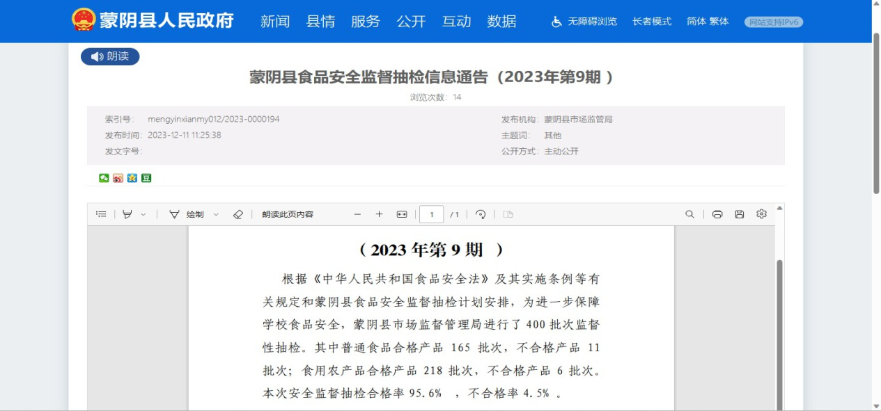 以发现问题、查找问题为切入口,制定切合实际的食品安全监管抽检计划,并严格按照流程开展抽检工作。在蒙阴县政务网设置食品安全专栏,对抽检要素、检查依据、检验机构、检查结果等进行公开,定期更新生产、流通、餐饮各环节食品安全抽检信息,做到“过程全透明、结果全公开”,同时对抽检不合格食品进行核查,公布核查结果。