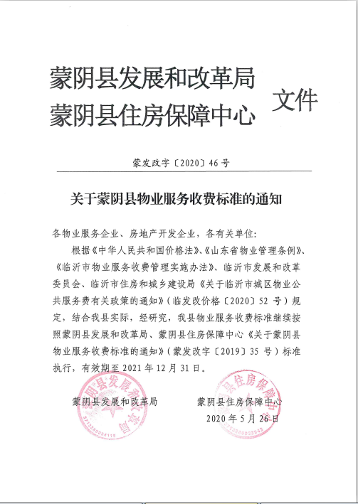 【价格和收费】关于蒙阴县物业服务收费标准的通知